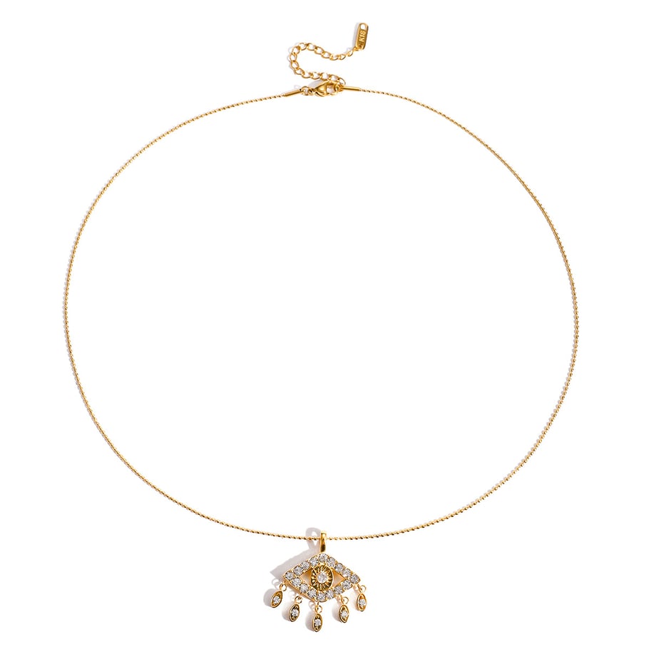 Keep positivity close and negativity at bay with our Evil Eye Pendant Necklace, a powerful symbol of protection and good fortune. Crafted from premium 18K gold plated stainless steel, this statement piece features a CZ stone encrusted evil eye pendant surrounded by five delicate dangling charms, each one catching the light with every movement.